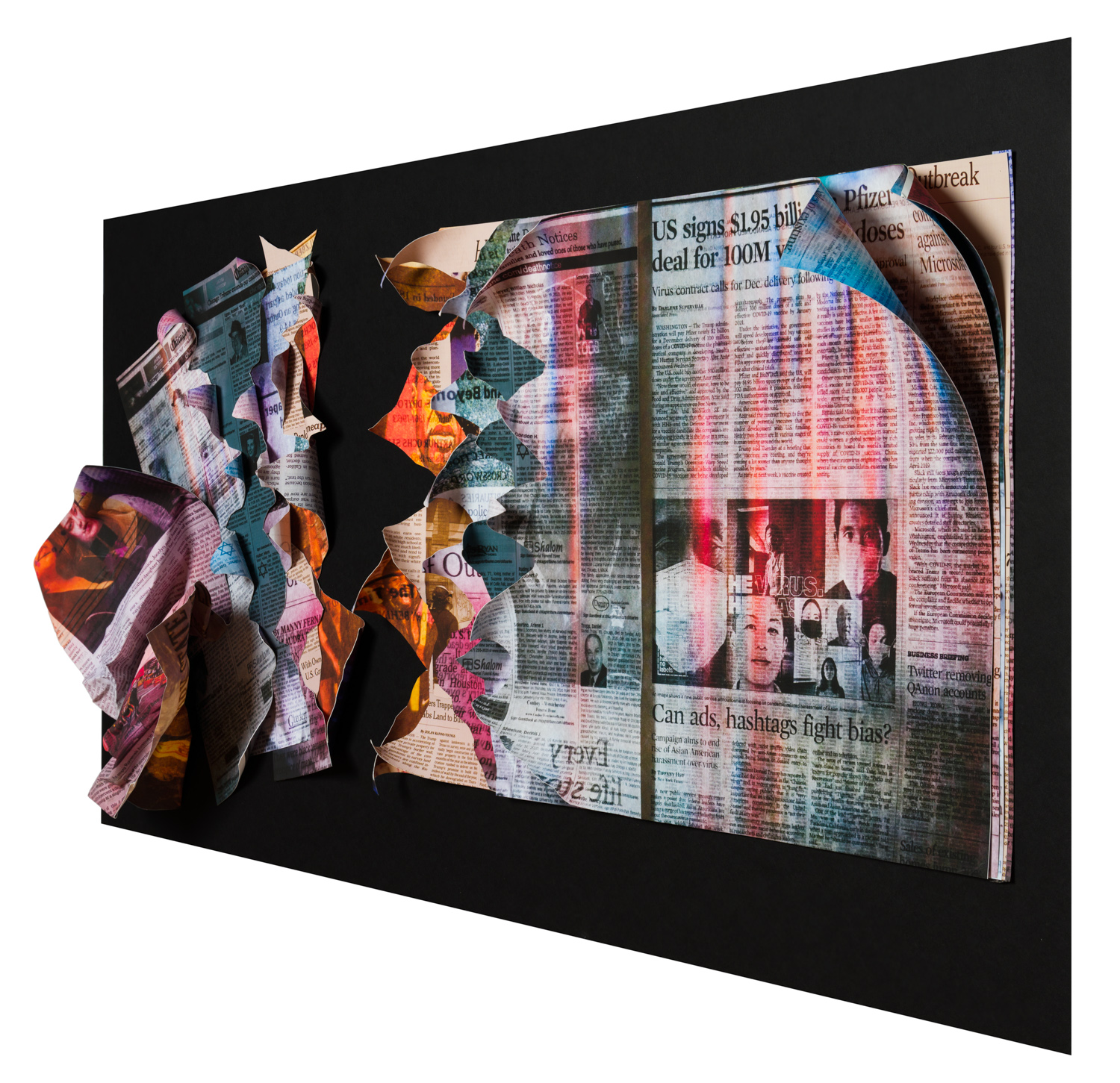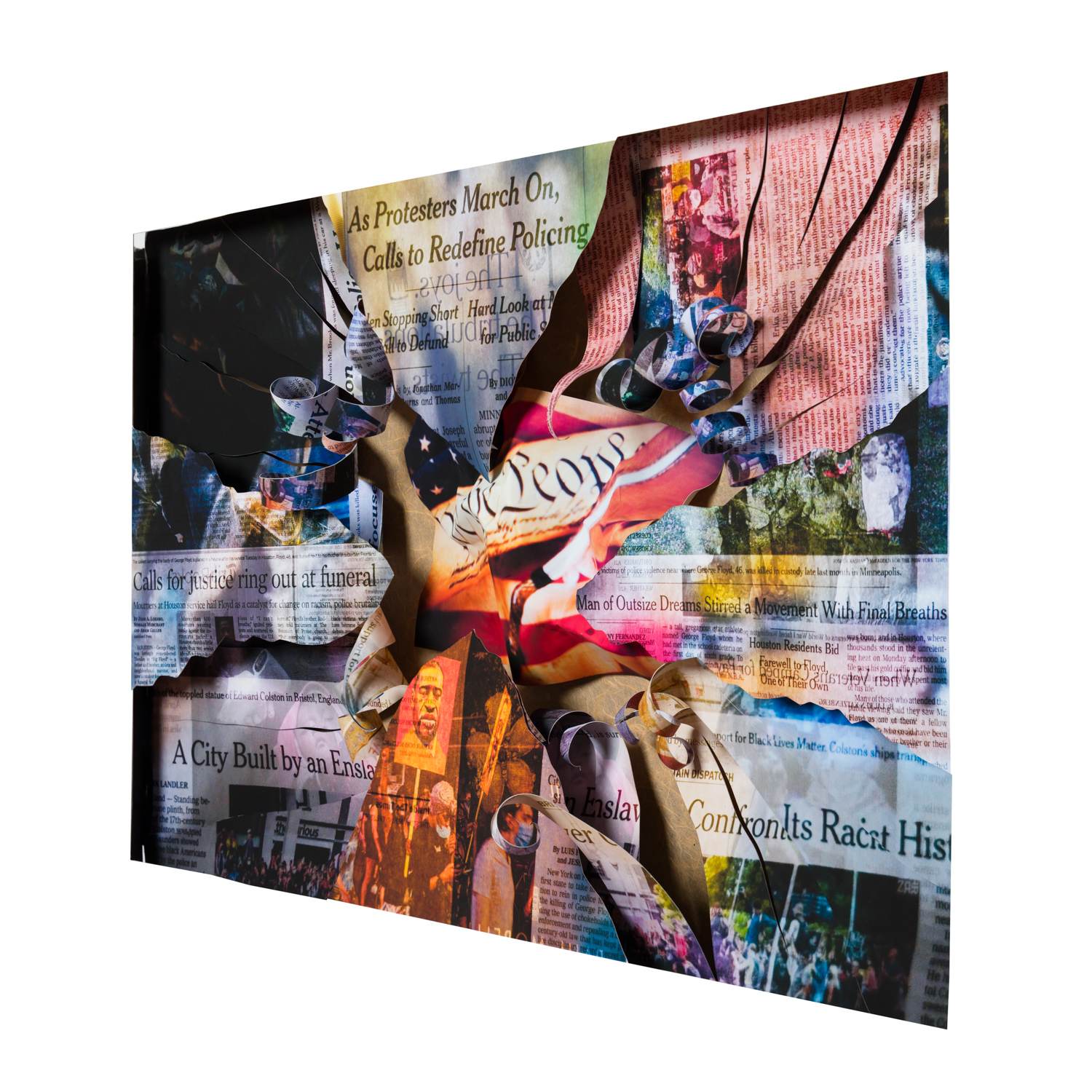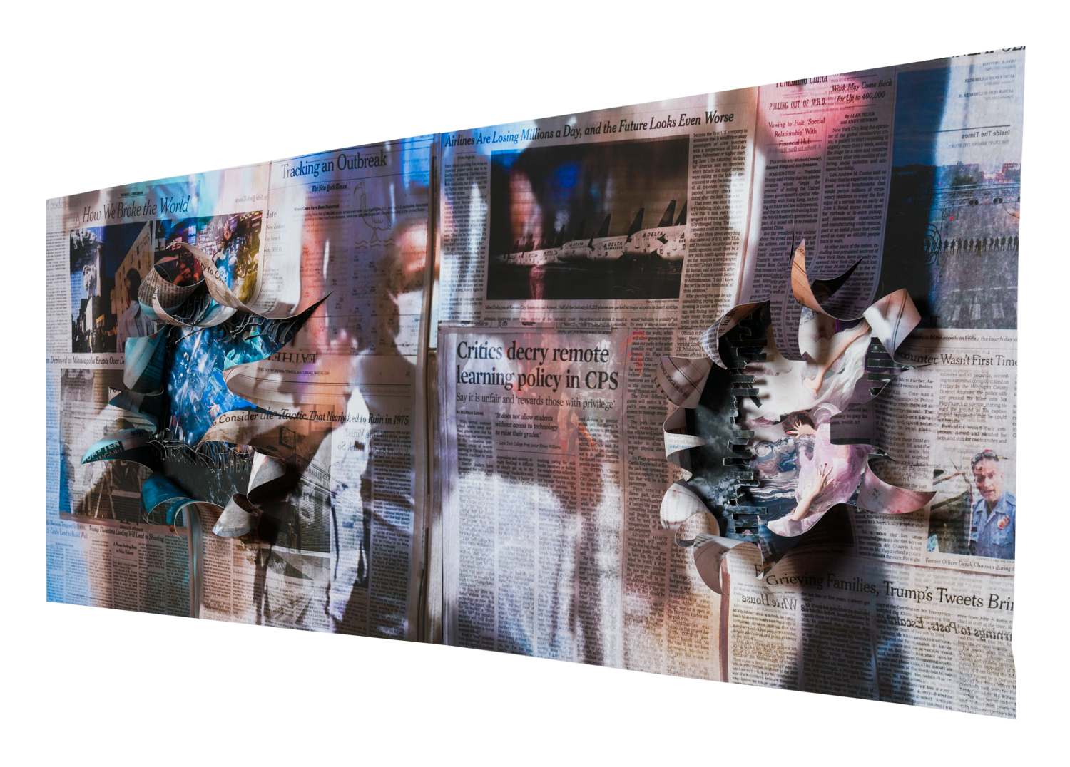 Fearing being exposed to COVID, I did not grab my camera and go to the streets but, instead decided to work with my photo archives, newsprint, and my computer. I wanted each collage to represent my fears and anger at what was taking place politically, medically, socially and economically.