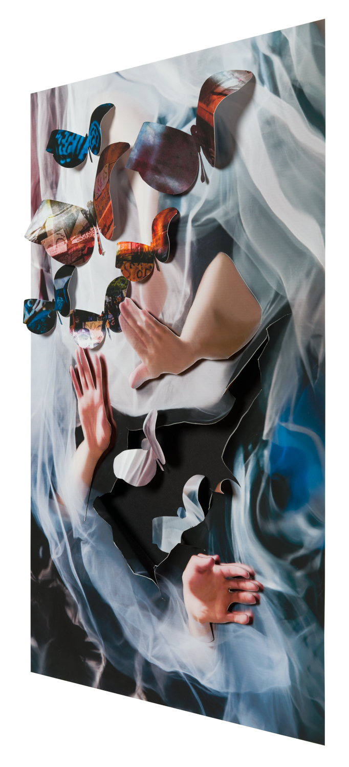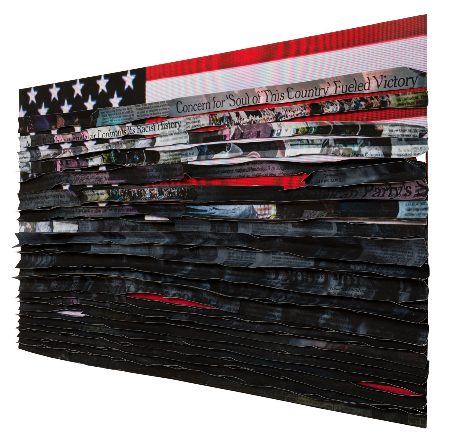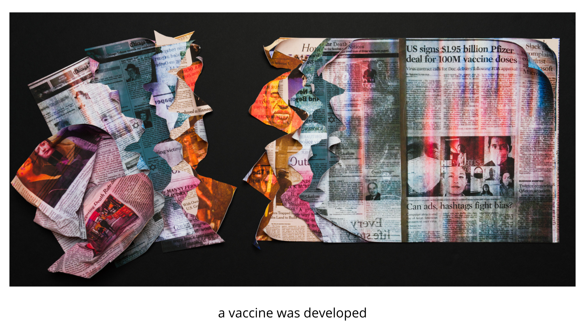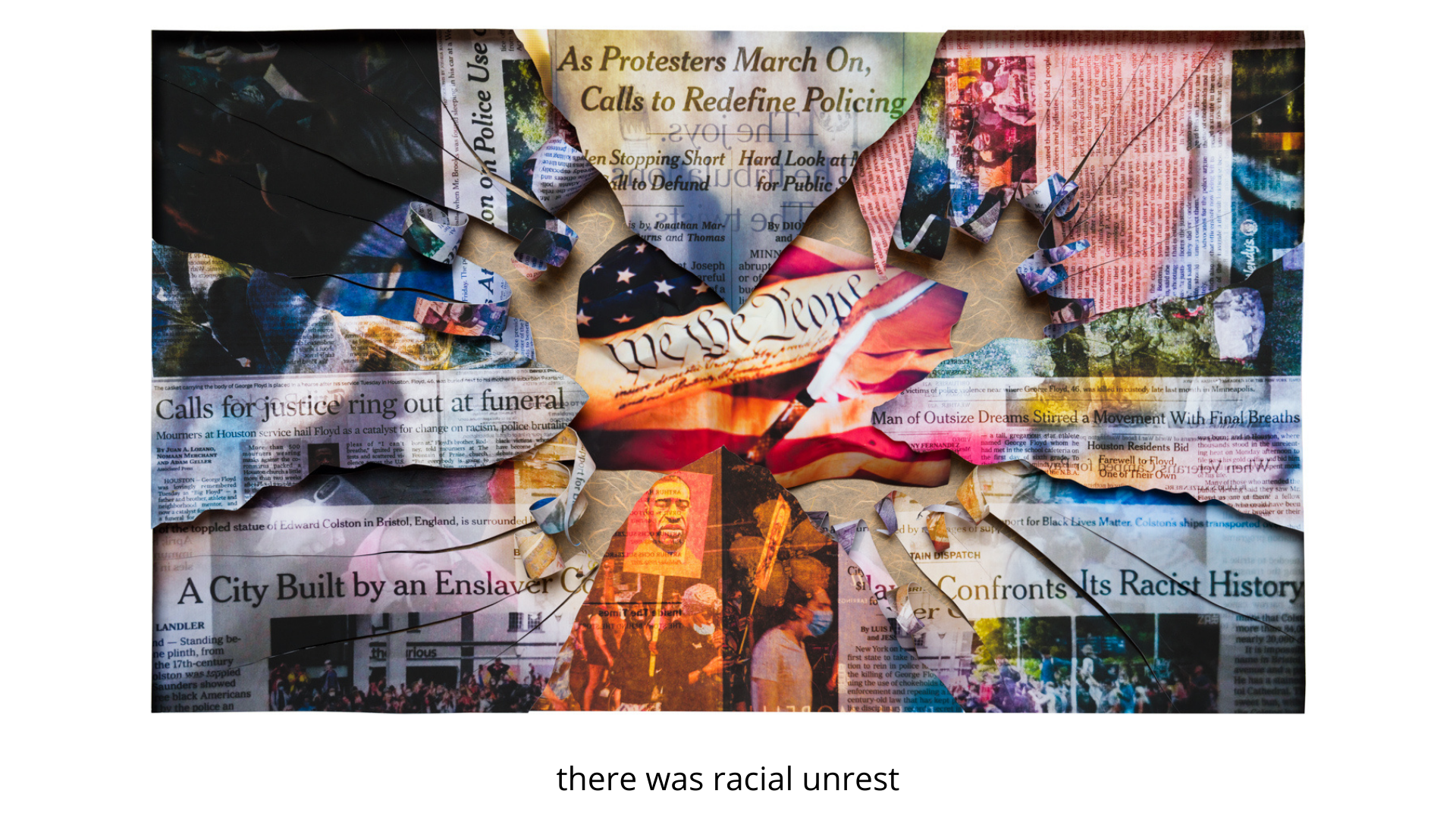 Fearing being exposed to COVID, I did not grab my camera and go to the streets but, instead decided to work with my photo archives, newsprint, and my computer. I wanted each collage to represent my fears and anger at what was taking place politically, medically, socially and economically.