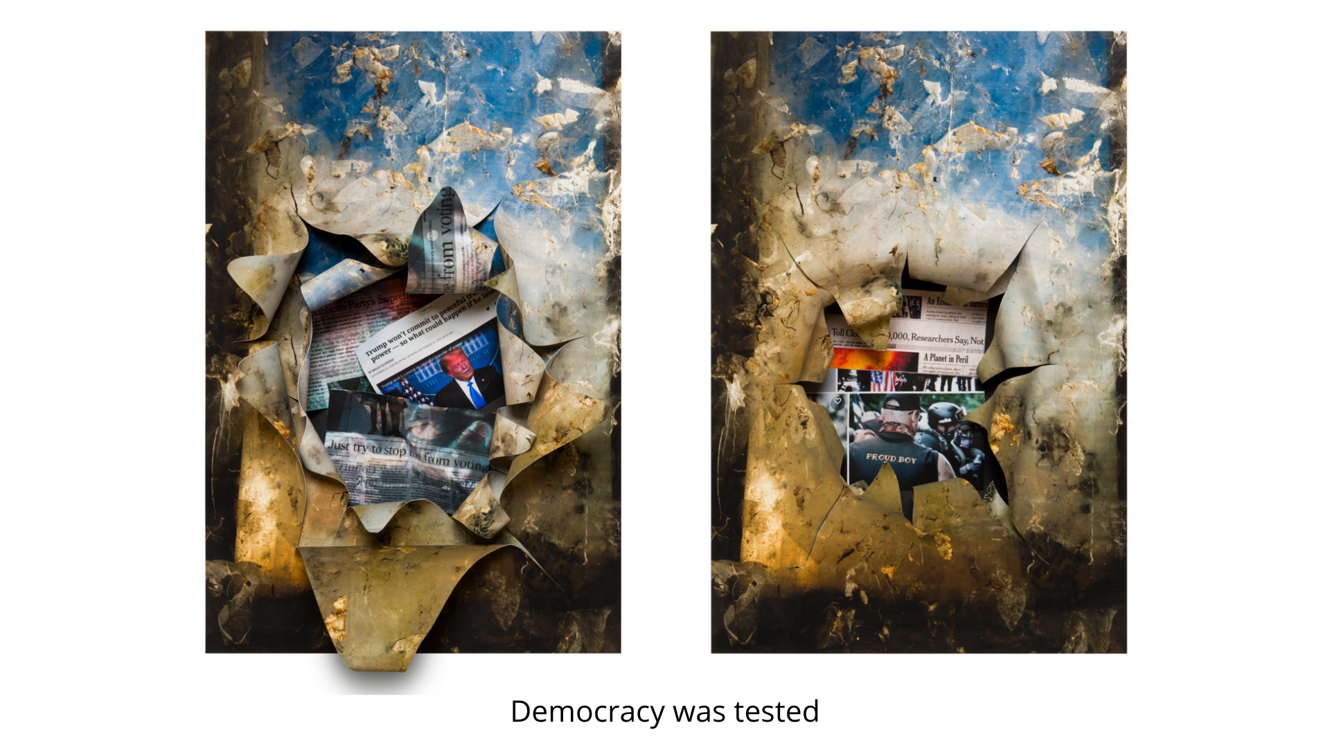 When the history books write about the 21st Century, the years 2020 and 2021 will stand out as the most influential period in America. I chose to tell a version of what transpired with my art. I starting making collages in March 2020, when we were first advised to stay sheltered at home.