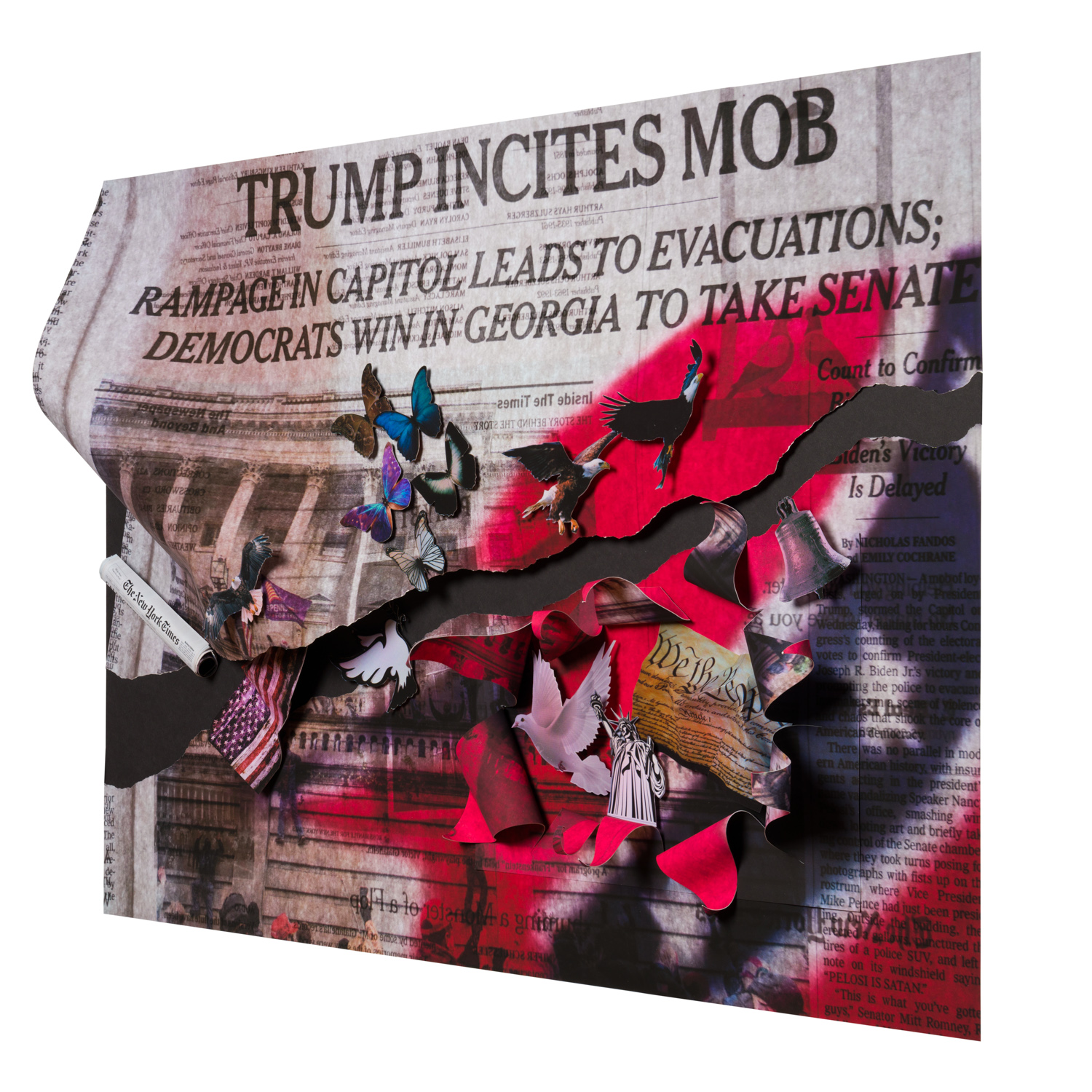 When the insurrection of January 6 took place, I thought it might be a good ending place for my collage-making. Instead, it was the beginning of another story about the battle to maintain our democracy. Again I start that story with fear and anger: fear that our American way of life is being threatened and anger at the thought that a political party could endorse such a notion.